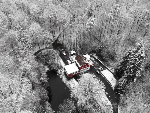 Umgeben von idyllischen Teichen, weichen Lichtstimmungen und einer Naturkulisse, die zu jeder Jahreszeit ihren eigenen Zauber entfaltet liegt die Eventlocation. Im Frühling erwacht das Gelände in frischem Grün, im Sommer bietet der Wald wohltuende Kühle, im Herbst leuchten die Bäume in warmen Farben und im Winter entsteht eine ruhige, fast märchenhafte Atmosphäre. Diese besondere Lage macht jede Veranstaltung zu einem Erlebnis, das sich anfühlt wie ein kleiner Rückzug aus dem Alltag.